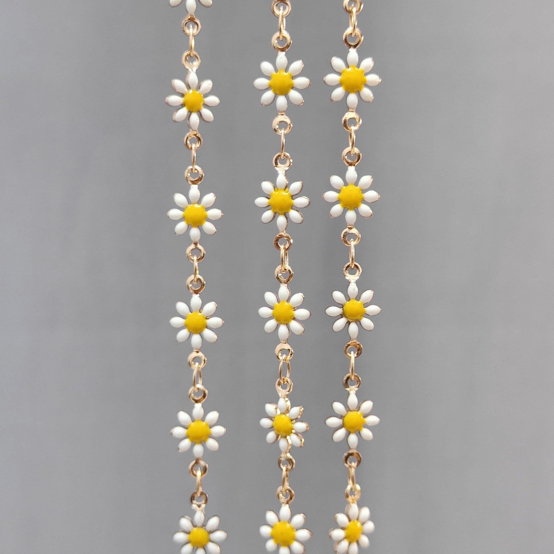 🌼 Add a touch of fresh floral elegance to your jewellery creations with our 18K gold-plated stainless steel daisy chain, designed with delicate 8-petal daisy flower links that bring a soft, aesthetic and cheerful vibe to every piece. Finished in a rich gold tone with white enamel petals and a vibrant yellow centre, this daisy chain is perfect for creating trendy yet timeless jewellery & accessories.