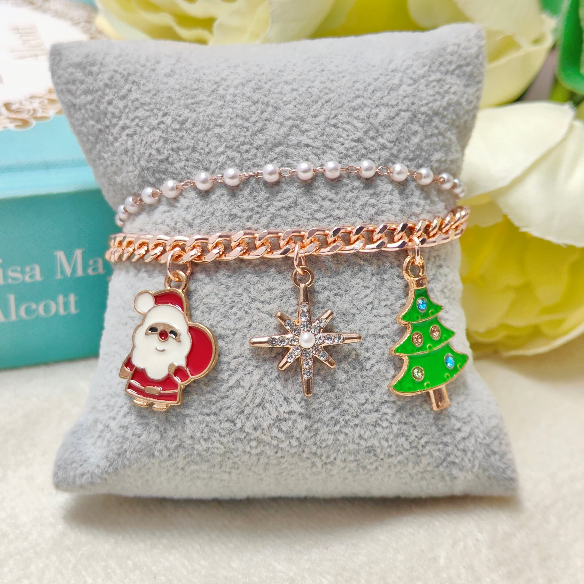 Rose Golden Three Charms Combo Christmas 2-Layer Bracelet (Design 9A)