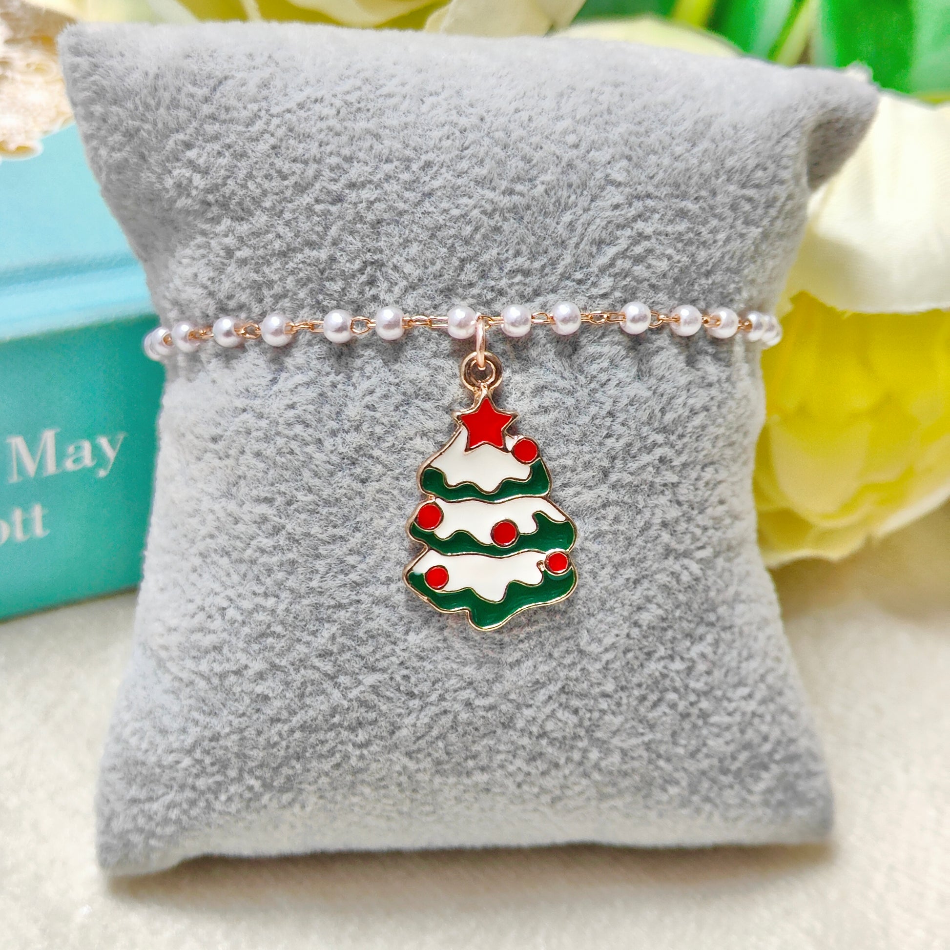 Snowy Xmas Tree Rose Golden Christmas Pearl Chain Bracelet