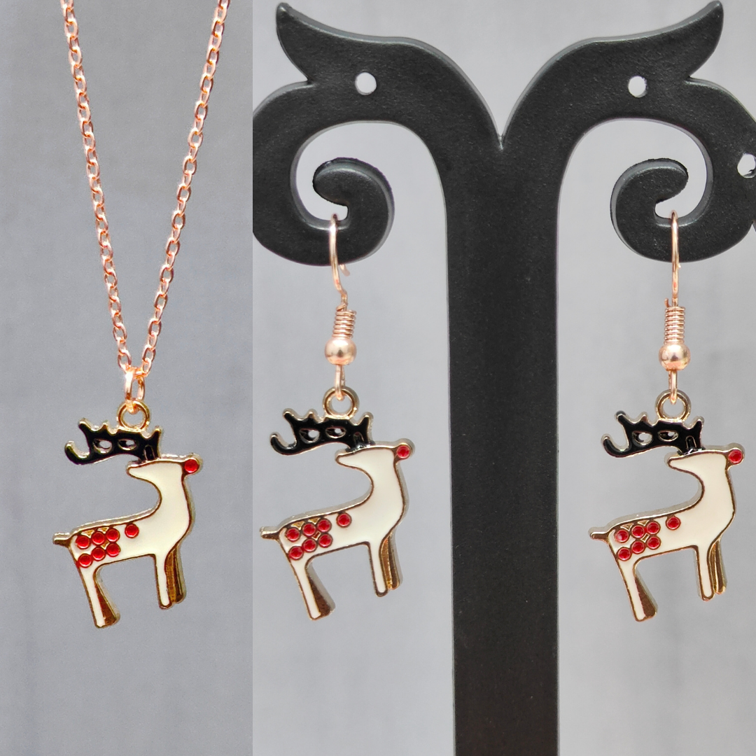 Spotted Reindeer Rose Golden Christmas Pendant Set (Necklace & Earrings)